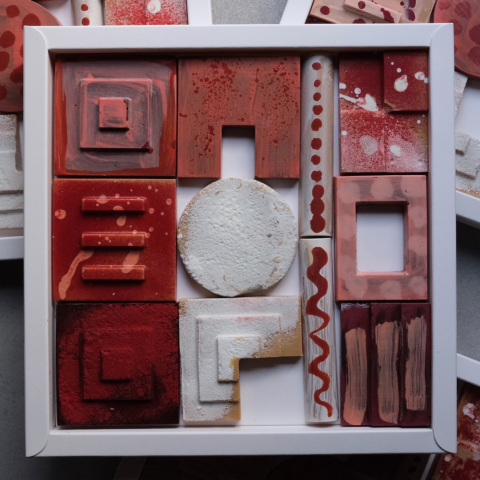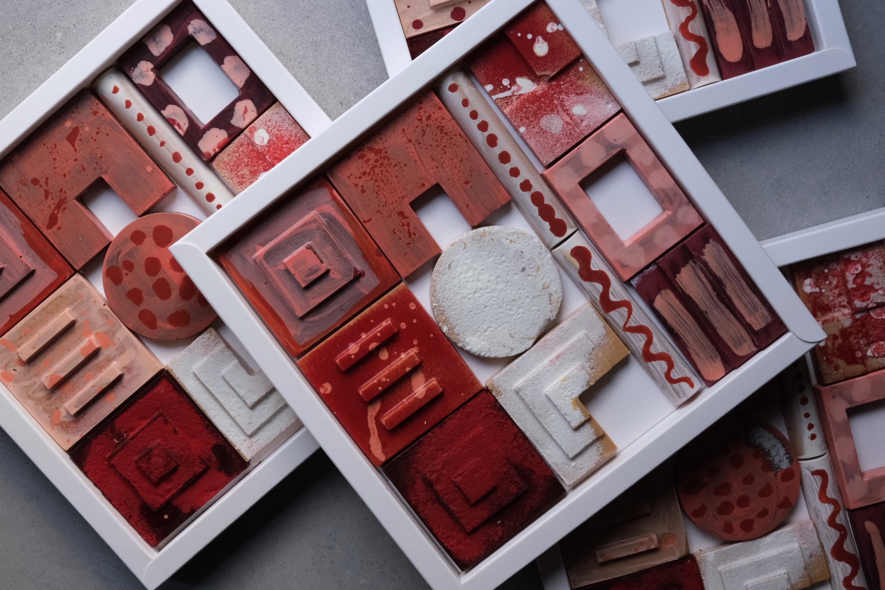 Duży set minimalistycznych geometrycznych czekoladek w trzech smakach: mlecznej, karmelowej i deserowej czekolady.